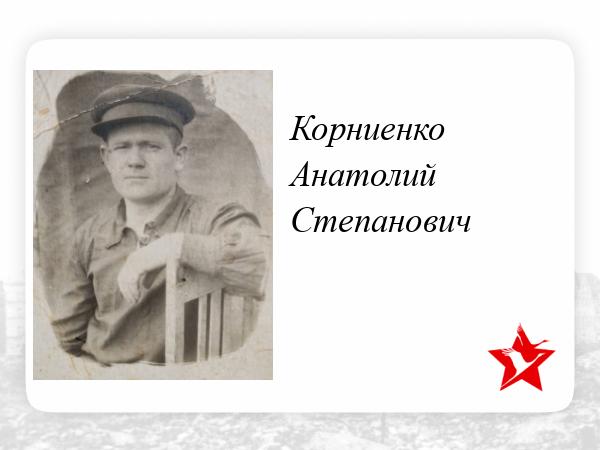 От имени Президиума Верховного Совета Союза ССР, за образцовое выполнение боевых заданий командования на фронте борьбы с немецкими захватчиками и проявленные при этом доблесть и мужество награждён Орденом «Славы III Степени». Старший сержант Корниенко Анатолий Степанович в боях за высоту 1056 и деревню Подкачи 10.09.1944 года показал себя бесстрашным воином и умелым инициативным командиром. Действуя в составе танкого десанта, метким огнём из автомата поражал гитлеровцев, стремившихся укрыться от танков в траншеях. Увлекая своим примером отваги и самоотверженности остальных бойцов первым ворвался в траншею противника где в рукопашном бою сам лично уничтожил четверых гитлеровцев будучи не ранен не ушёл с поля боя, продолжая управлять боем взвода и ещё с большой ненавистью поражать гитлеровцев. Награждён медалью «За Отвагу» за то что одним из первых форсировал реку Буг и закрепился на Западном берегу реки обеспечил переправу 3 стрелкового батальона, уничтожив при этом пятерых гитлеровцев.