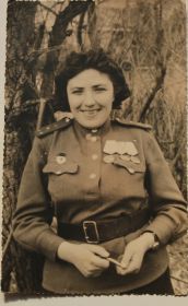 Окончила Кубанский медицинский институт в июне 1941 г. в г.Краснодаре. Призвана на воинскую службу в ноябре 1941 года. С ноября 1941 года по июль 1942 года участвовала в героической обороне Севастополя.( С декабря 1941 по апрель 1942 в составе 79 морского батальона, c апреля 1942 года по июль 1942 года - 224 мед. сан.бат. 172 стрелкового дивизиона в.врач мед.сан.бата). С марта 1943 по ноябрь 1943 участвовала в обороне Кавказа, (Северо- Кавказский фронт 714 стрелковый полк 395 стр. дивизия - мл. врач мед.сан. роты). С ноября 1943 по апрель 1944 в составе 395 стр. дивизии участвовала в освобождении Кубани( 723 стр. полк - младший врач полка мед.сан.роты). С апреля 1944 по август 1945 участвовала в освобождении Украины, Венгрии, Чехословакии - 129 отдельный гвардейский б-н связи 17 гвардейский стрелковый корпус 1 и 4 Украинский фронт - военный врач батальона связи. В 1943 году присвоено знание Капитана медицинской службы. Уволена в запас в сентябре 1945 года в звании Гвардии Капитан медслужбы, военврач.