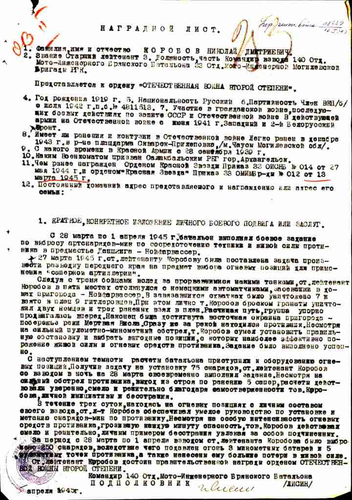 Коробов Николай Дмитриевич , 1919 г.р., уроженец д. Филисово Житьевского с/с Сямженского р-на Вологодской обл. Призван Соломбальским РВК Архангельской обл. 28.09.1939 года . В Отечественной войне участвовал с июня 1941 года на Западном фронте и с 01.05.1944 года - 2-й Белорусский фронт . Командир взвода мл. лейтенант Коробов 140 сапеного батальона в составе 33-й саперной бригады ( с 20.04.1942 года преобразована в 33 отд. инженерную бригаду спецназначения , затем с 03.06.1944 года преобразована в 33 отд. моторизованную инженерную бригаду - до конца войны ) . Взвод лейтенанта Коробова обеспечивал проходы в инженерных заграждениях противника , обеспечивал в инженерном сопровождении 385 и 49 стр. дивизии в декабре 1943 года , 70 стр. корпус - в апреле -мае 1944 года . В Могилевской обл. 25 декабря 1943 года тов. Коробов был контужен и легко ранен , проявив при этом мужество и отвагу и умение организовать работу по установке и переустановке мин . Выполняя боевое задание по разминированию городов Бродница , Цеханув и Торн в марте 1945 года взвод Коробова отличился хорошо продуманной организацией работ и являлся образцом в выполнении поставленных задач . Разминируя мост через реку Висла в г. Торн , обнаружил и обезвредил два фугаса , заложенных в опорах моста с сюрпризом натяжного действия . Сняв 21 сюрприз и 1240 кг взрывчатки , саперы дали возможность быстро восстановить мост , тем самым сохранив стратегический объект для движения наших войск . В апреле 1945 года взвод Коробова отличился в предместье Данцига ( г. Гданьск , Польша ) при выполнении боевого задания по выбросу артснарядов и мин по сосредоточению техники и живой силы противника . В течении трех суток Коробов обеспечивал умелое руководство по установке и метанию снарядов - мин по противнику , тем самым нанесли большой урон в живой силе и технике противника . За период военных действий командир взвода Коробов был награжден дважды орденом Красной Звезды , орденом "Отечественной войны 2 ст" , также медалями "За победу над Германией..." , "За оборону Москвы" , "За освобождение Варшавы" . После Победы вернулся домой . В честь 40-летия Победы награжден юб. орденом "Отечественной войны 1 ст" .