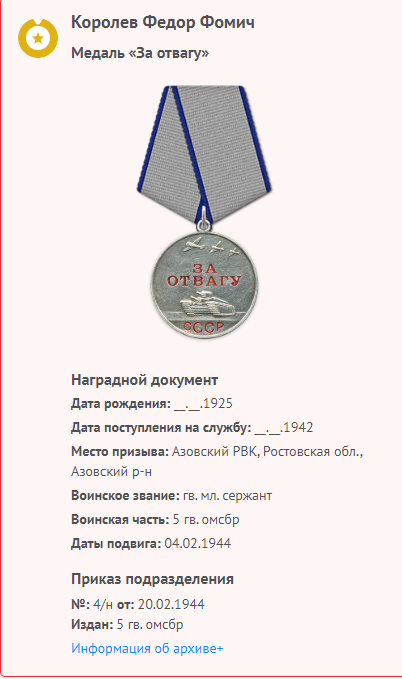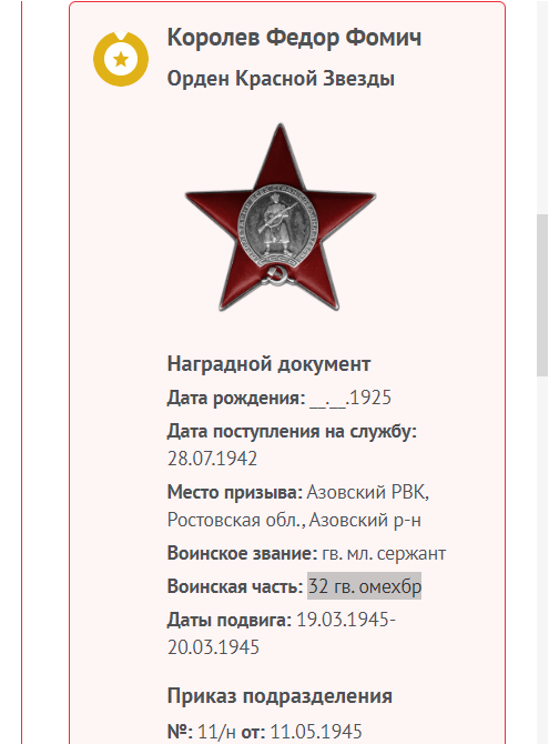 Прошел боевой путь в составе: 32 гв. омехбр , Награжден медалью "За отвагу" и орденом "Красной звезды"