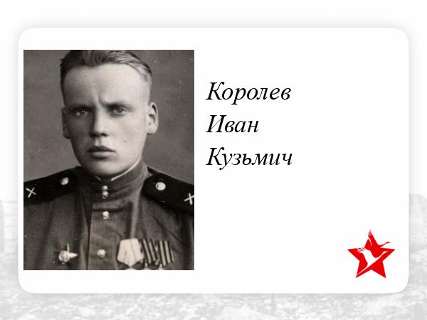Информация из портала «Память народа»: Орден Красной Звезды Королев Иван Кузьмич Дата поступления на службу 30.06.1944 Место призыва Лиозненский РВК, Белорусская ССР, Витебская обл., Лиозненский р-н Воинское звание красноармеец Воинская часть 980 ап 17 сд 48 А 3 БелФ Даты подвига 31.01.1945,02.02.1945,03.02.1945,18.02.1945 Приказ №: 168/н от 08.03.1945 Издан 17 КСД 48 А 3 Белорусского фронта