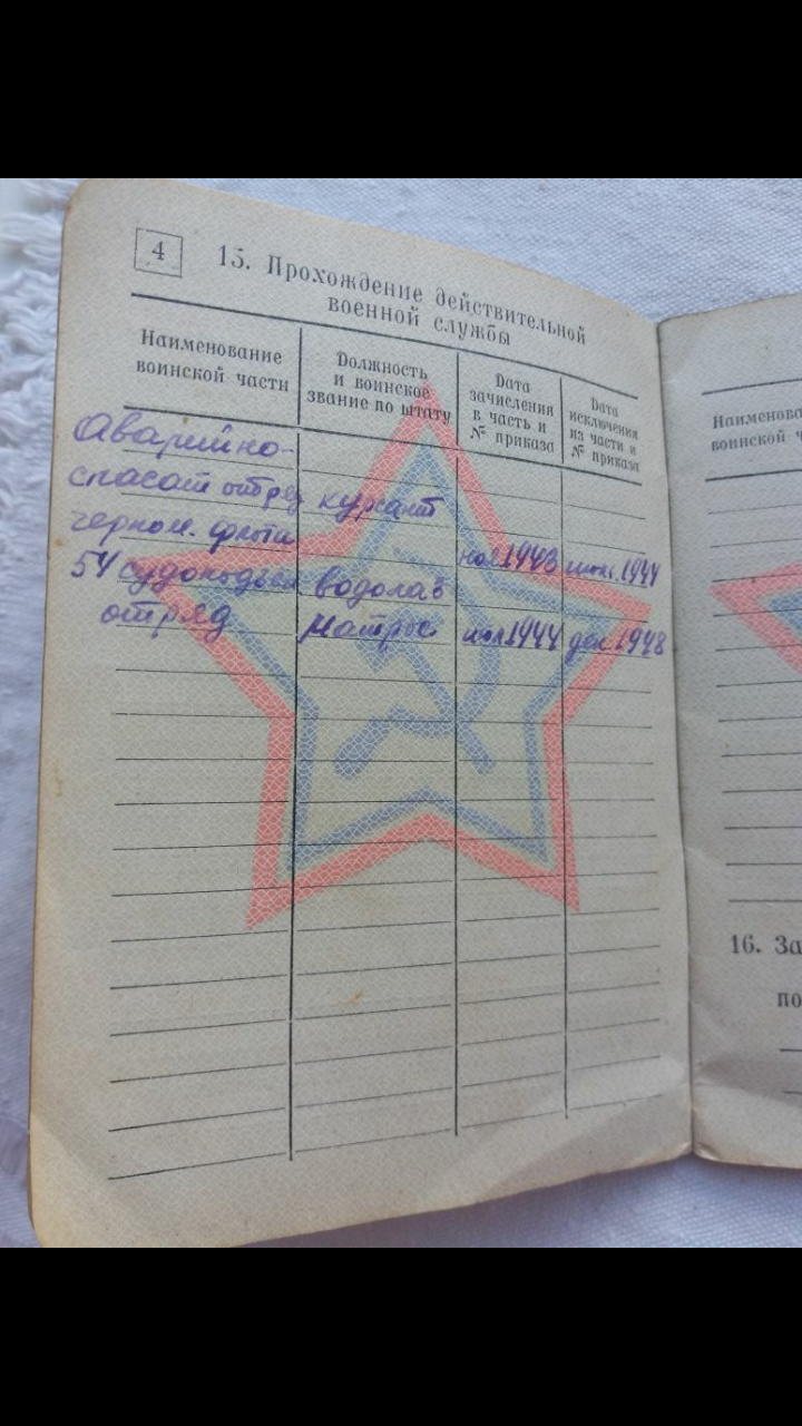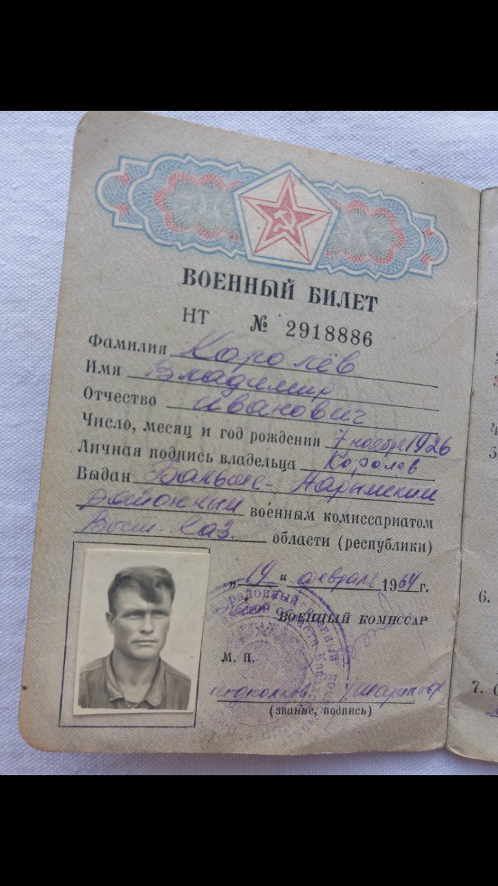 Королёв Владимир Иванович в годы войны был водолазом ,аварийно -спасательный отряд Черноморского флота,54 судоподьёмный отряд с июля 1944 по декабрь 1948г. После войны жил в с.Мало-Нарымка в Восточном Казахстане. любил фотографировать,занималься пчеловодством и ходил на охоту. Умер в 1992 г,там же в Восточном Казахстане.