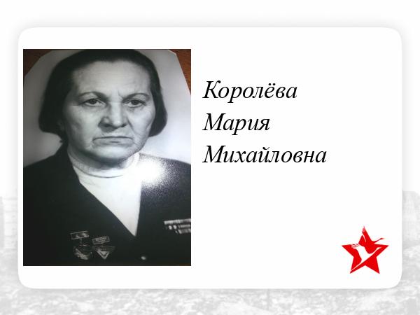 Моя свекровь, Королева Мария Михайловна, родилась в г. Череповец в 1910 г. в многодетной семье. В Ленинград она переехала жить к своей родной сестре Анне, с которой они пережили блокаду. Мария Михайловна получила мобилизационное предписание. В блокаду она работала в эвакогоспитале № 90, а когда госпиталь эвакуировали, ее перевели на ремонтно-механический завод "Ленводопровод" станочницей, где она на токарном станке вытачивала снаряды 38 кг. До войны работала счетоводом, в войну стала токарем.