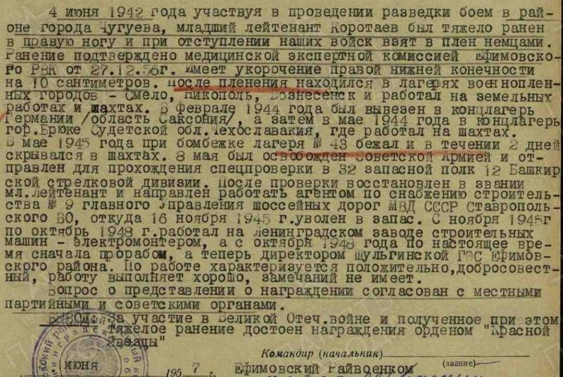 тяжёлые бои на Юго-Западном фронте. В начале июня1942г. был тяжело ранен и захвачен немцами в плен. В феврале 1944г. вывезен в концлагерь в Саксонию (Германия), а в мае 1944г. перемещён в концлагерь в Судетскую область, откуда бежал. Вместе с чешскими патриотами сражался с фашистами. Был пойман, отправлен в концлагерь, снова бежал. За мужество Коротаев Иван Васильевич награждён Орденом Красной Звезды. Ему присвоено звание "Почётный гражданин г. Брно".
