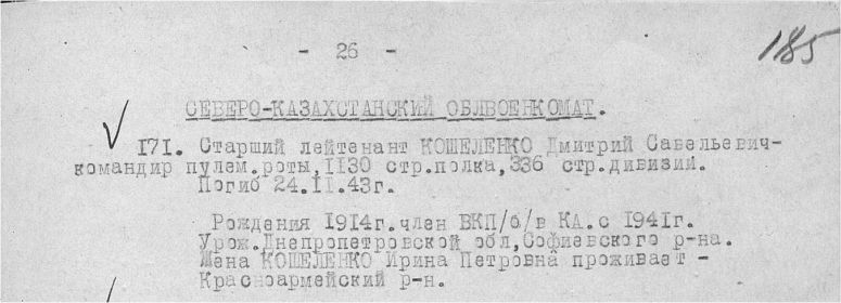 Дмитрий Савельевич родился в 1914 году в с.Софиевка Софиевского района Днепропетровской области.Призывался в 1941г. Красноармейский РВК Северо-Казахстанской области. Служил командиром пулемётной роты 1130 стрелкового полка 336 стрелковой дивизии.Погиб в 24.11.1943 г. в Житомирской обл. Коростенского района с.Березовка Юго-Восточнее 400 метров. Награжден орденом Александра Невского (приказ № 83-н от 31.10.1943 г.) (На фото Дмитрий Савельевич слева)