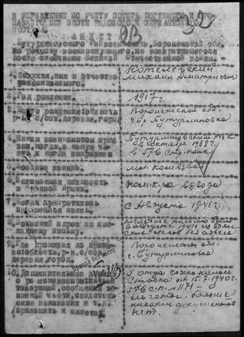 Старшина Котелевский Михаил Дмитриевич 1917 г.р. На 3 году службы. Призван в 1938 году в 576 полк. Уроженец: Воронежская обл., г. Бутурлиновка. Числится в списках 3 стрелковой роты, 576 стрелкового полка, 115 стрелковой дивизии. Отец: Котелевский Дмитрий Михайлович, разыскивал сына 1948 году. Письменная связь прекратилась в августе 1941года. По спискам РВК считается пропавшим без вести. Вероятно, погиб в августе 1941г. в Куйсма.