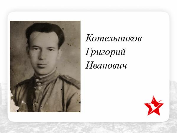Котельников Григорий Иванович родился 18 декабря 1909 года в Челябинской области, станция Вязовая. Военную карьеру он начал в 1931 году в возрасте 22-уж лет. Участвовал в Советско-Финской войне. На тот момент он уже являлся кадровым офицером. Великую Отечественную войну Григорий Иванович вместе с женой Анной Илларионовной и 4-мя детьми встретили в Полтаве. Из-за опасности нападения вражеских войск активно проводились массовые эвакуации гражданского населения. В одной из таких эвакуаций пропала их 9-летняя дочь Люда, позже от болезни умерли 2-ое мальчиков. Остался только младший сын, да и то контуженный. Григорий Иванович был призван на фронт в звании капитана батареи самоходных установок.
