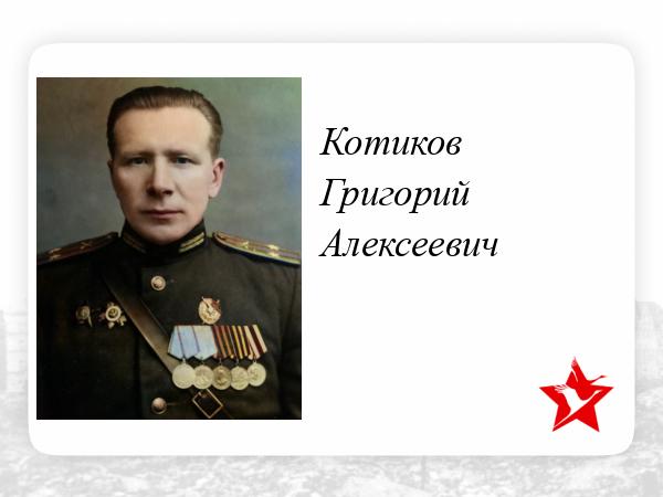 Котиков Григорий Алексеевич родился 20 августа 1910 г. В дер. Москалево Пустошкинского р- на, великолукской области. Звание подполковник, артиллерист. Призван 25.01.1933 г. Нарвским РВК Лен. Области, г. Ленинград. В 1936 г. Закончил О.В.Ш. им. ВЦИК. Батарея арт дивизиона первый выпуск лейтенантов РККА. Участвовал в войне с финнами, освобождал Ленинград от блокады, освобождал Кёнигсберг, Польшу. В войну командовал артиллерийским дивизионом и арт. разведкой. С дедом все охотно вызывались в разведку, так как все всегда с ним возвращались живыми (солдаты считали его заговоренным). Была кантузия, привела к плавающим осколкам по лицу, до смерти приносили дискомфорт и боли.