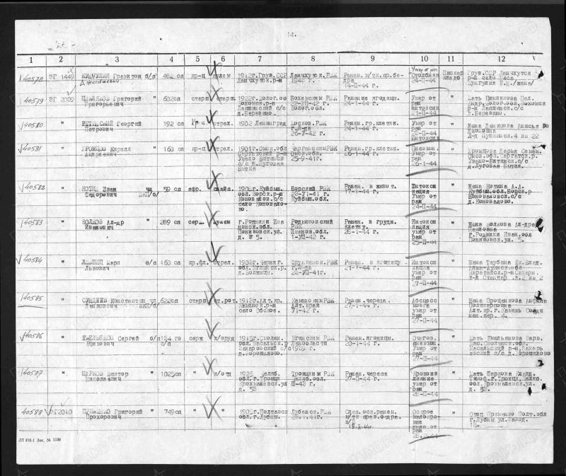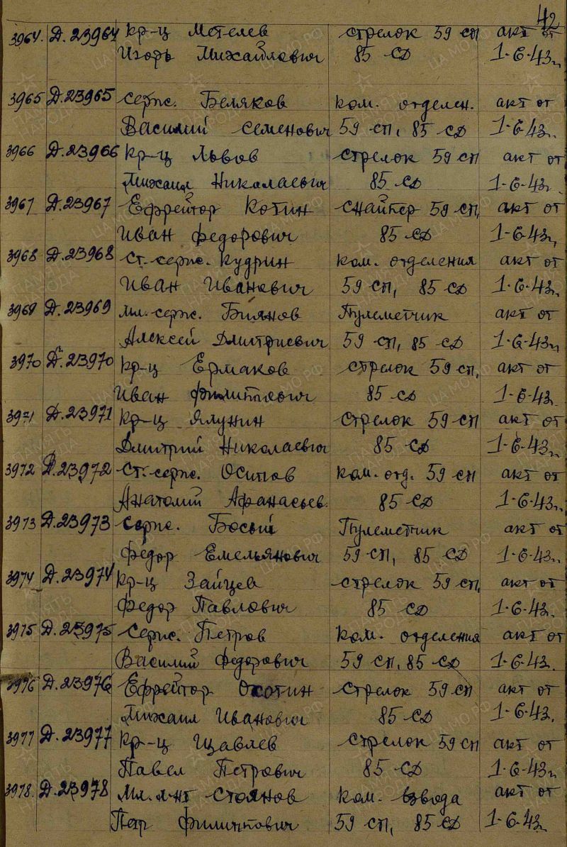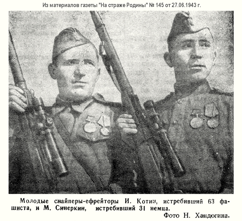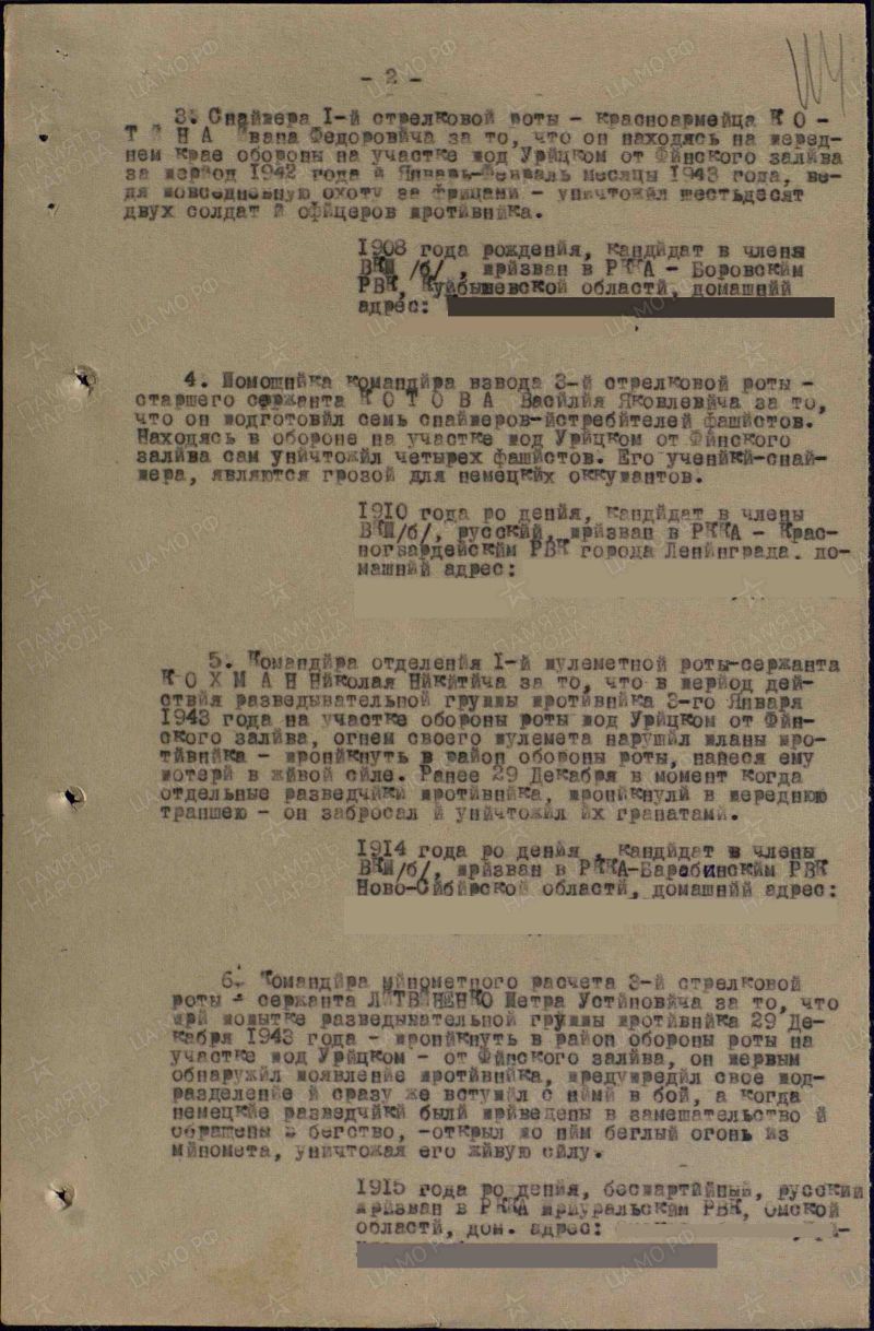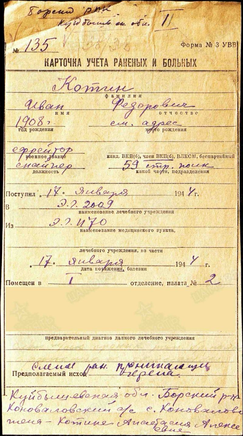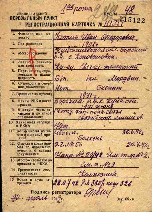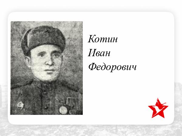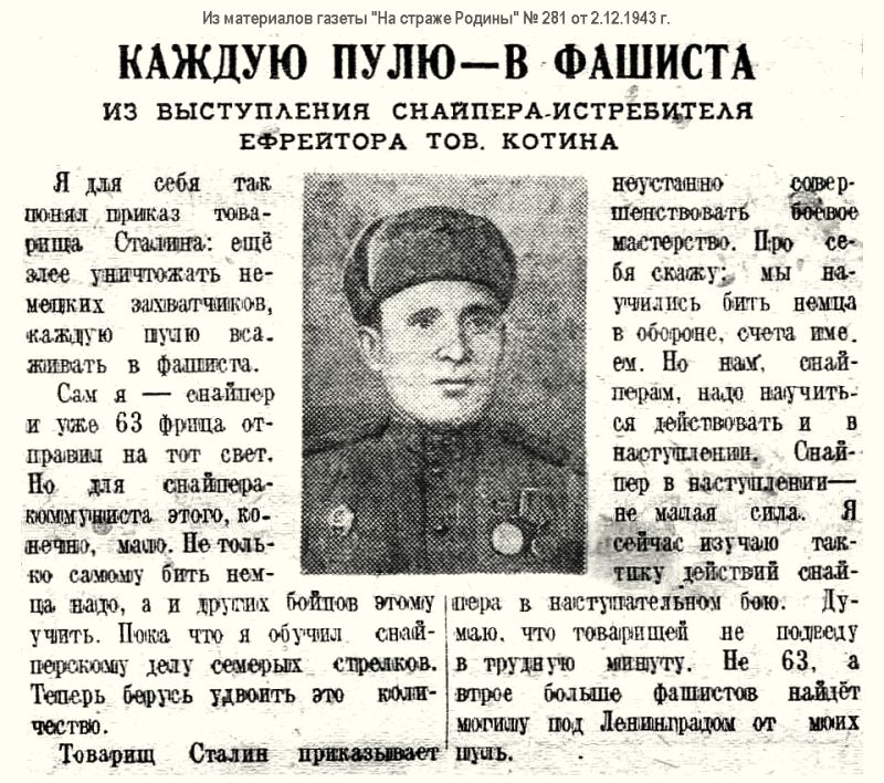 Котин Иван Федорович -красноармеец связист 466-го СП 125-й СД в боях с лета 1941г. 30.06.42г был ранен и направлен в ЭГ-56 откуда был выписан 20.07.42г. Затем ефрейтор-снайпер 1-й стрелковой роты 59-го СП 85-й СД Ленинградского фронта.. Член ВКП(б). Награжден медалью "За Оборону Ленинграда" под № Д-23967 от 01.06.43г по 42-й Армии Ленинградского фронта. За уничтоженные 62 фашиста награжден медалью "ЗА ОТВАГУ" от 21.02.43г.24.02.44г был тяжело ранен в живот и скончался в ЭГ-2009 в тот день. Похорен на Пискаревском кладбище 27.02.44г . Этот фронтовик мой односельчанин. Из газеты "На страже Родины" №281 от 2-го декабря 1943 года. Родился в 1908 году в селе Коноваловка (Борский район Самарской области). Образование получил начальное, работал в колхозе. С 1941 года в рядах Красной Армии, призван Борским РВК. С лета 1941 года на фронтах Великой Отечественной войны (сражался на Ленинградском направлении). Сначала был направлен 14-й отдельный запасной полк. Затем служил связистом в 466-м стрелковом полку (125-я стрелковая дивизия), освоил и снайперское дело. 30 июня 1942 года отправлен в госпиталь на лечение (по болезни). После лечения, 20 июля 1942 года переведён в другую часть. 20 февраля 1943 года снайпер 1-й стрелковой роты 59-го стрелкового полка (85-я стрелковая дивизия Ленинградский фронт) ефрейтор И. Ф. Котин был представлен командованием части к награде за уничтожение 62 солдат и офицеров противника. Приказом № 1/н от 21 февраля 1943 года по 59-му стрелковому полку награждён медалью "За отвагу". 1 июня 1943 года Приказом по 42-й Армии Ленинградского фронта награждён медалью "За оборону Ленинграда". По имеющимся сведениям, к июлю 1943 года имел на счету 63 уничтоженных фашиста, обучил снайперскому делу не менее 7 бойцов. Окончательный итог его боевой работы не известен. 17 января 1944 года был тяжело ранен (в голову и ноги), 24 февраля 1944 года умер в эвакогоспитале № 2009. Похорен на Пискаревском кладбище.