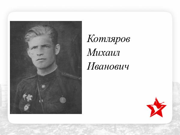 МИХАИЛ ИВАНОВИЧ КОТЛЯРОВ, 1919 года рождения, прошёл войну командиром взвода разведчиков в 3-й гвардейской стрелковой дивизии. Освобождал Украину, Белоруссию, Прибалтику. Награждён орденом Красной Звезды и орденом Отечественной войны II степени.