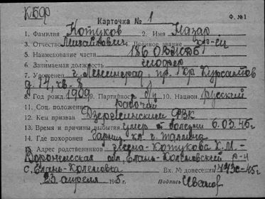 Мой дед по отцу Котуков Назар Михайлович родился 1909г. в селе Елань-Колено Новохопёрского района Воронежской области. До войны был шофёром, водил кинопередвижку по району. Вся семья проживала в этом селе. К началу войны он был женат Котуковой (Буравлёвой) Ксении Мироновне 08.02.1911-28.02.1997 и имел 3-х детей: Котукова Виктора Назаровича 03.05.1933-11.03.2014; Котукову (Литвинову) Нину Назаровну 01.05.1936- 08.05.2011; Котукову Валентину Назаровну 1939-1941 (умерла от кори в детстве) Был призван в г.Ленинграде Дзержинским РВК и почему-то в учетной карточке было написано: уроженец г.Ленинград пр.Кр.Курсантов д 14 кв 8. На этот адрес (общежития, или казармы) он попал, когда всех мужчин мобилизовывали. Его забрали вместе с полуторкой, на которой он работал и самоходов в Ленинград. Он попал на Балтийский флот в автомобильный батальон на Дорогу жизни на Ладоге. Был ранен, после госпиталя был в отпуске -дома. Награжден медалью "За оборону Ленинграда". После окончания работы Дороги Жизни был переведен на легковую машину и возил военное начальство. В начале марта 1945г. недалеко от города Таллинна (Эстония) на овобожденной от фашистов территории был найден тяжелораненным в автомбиле при сопровождении военначальника с пакетом (начальник исчез). Умер от ран в госпитале г.Таллина по общению с однополчанами (по документам умер от болезни) 06.03.1945, не дожив до победы 2 месяца. Похоронен на 3-ем воинском (гарнизонном) кладбище г. Таллина (Эстония). Были там с его женой (моей бабушкой) в 1986 г. Имеется именная табличка. По информации знакомых 2002 г всё было цело на кладбище. Если кто-то что-либо знает о нём ещё - пишите. Будем благодарны.