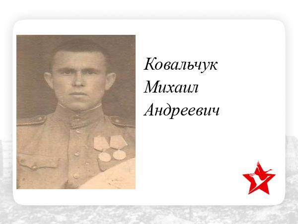 В наградном листе командиром второго танкового батальона майором Тесля отмечено «Ковальчук участвуя в боях в составе батальона в должности шофера в р-не г.Городок Витебской области с 14.11.1943 по 07.01.1944, в районе Инструбище 17.03.44 в районе Двинск и других населенных пунктов Латвийской ССР с 17.07 по 22.09.1944 показал себя смелым и решительным. За время своей работы на автомашине т.Ковальчук все время находился с боевым порядком батальона и обеспечивал подвозом ГСМ, боеприпасами и АТБ имуществом. За проявленное мужество и отвагу в боях с немецкими захватчиками достоин правительственной награды медали "За боевые заслуги"».