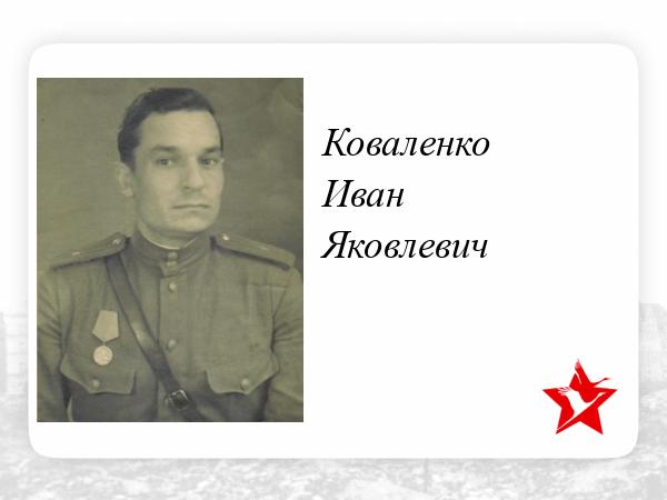 Мой двоюродный дед по маме Иван Яковлевич Коваленко родом из Ростова-на-Дону. Поступил на службу в Красную армию в ноябре 1936 года (в г. Тула). Участвовал в советско-финской войне 1939-1940 годов. Прошел всю Великую Отечественную войну, к 1945 году в звании майора. Воевал в 624 стрелковом полку 137 стрелковой дивизии. В апреле 1945 года был награжден орденом Красной Звезды (представлен к ордену Красного Знамени) со следующим описанием подвига в наградном листе: "В сентябре месяце 1941 года, работая инструктором пропаганды... полка на Брянском фронте, когда командир полка вследствии ранения выбыл из строя, а Военком со штабом полка отбился от полка принял на себя командование полка и командуя в течении двух недель, вывел полк с боями из окружения, форсировав реку Сож и в районе севернее Пропойска соединился с дивизией. Работая Зам. Командира полка по п/ч. неоднократно участвовал в боях на Брянском Фронте и с июля 1942 г. по ноябрь 1943 г. в битве за г. Сталинград в составе 62й Армии. Выбыл из строя после контузии". В послевоенное время продолжил службу в звании полковника.