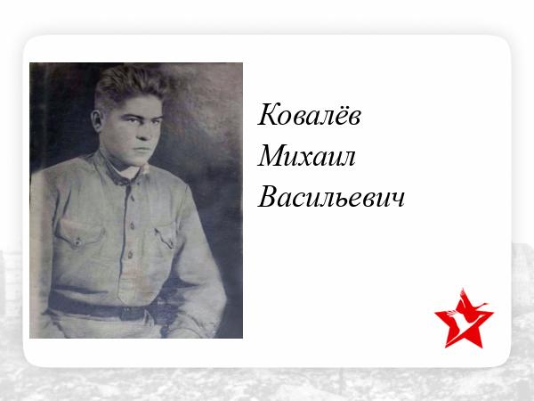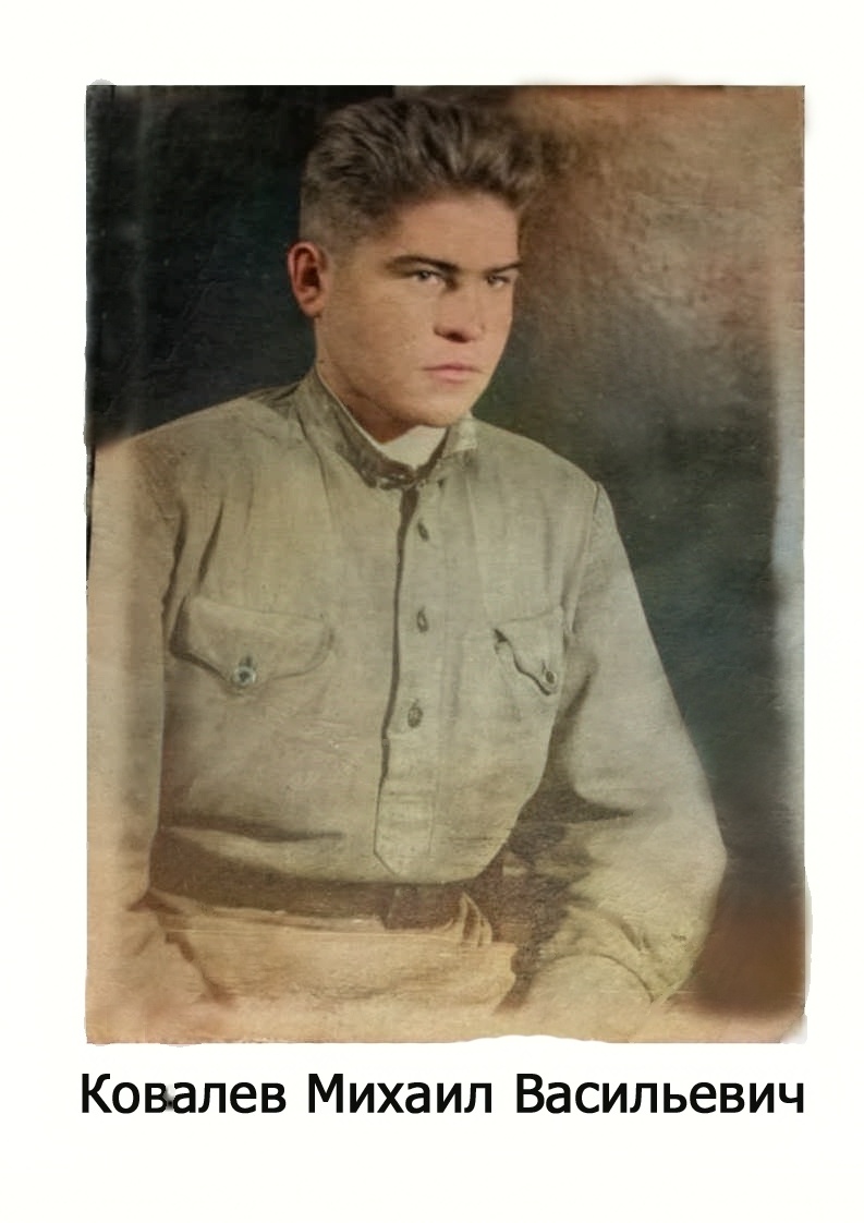Ковалев Михаил Васильевич, 20.11.1924г.р. родился в с.Большие Березники, Большеберезниковского района, Мордовской АССР. Будучи 17 летним курсантом, с октября 1942г. по январь 1943г. проходил обучение в школе оружия учебного отряда в составе Краснознаменного Балтийского флота. 24.11.1942г. принял военную присягу. С января 1943г. по апрель 1943г., будучи солдатом, служил автоматчиком 268 стрелковой дивизии Ленинградского фронта. В наступательных боях под с.Красный Бор 23.03.1943г. получил легкое ранение бедра. С апреля 1943г. по июнь 1943г. служил стрелком 223 запасного стрелкового полка Ленинградского фронта. С июня 1943г. по август 1944г. служил наводчиком противотанковых орудий 309 стрелкового полка Ленинградского фронта. 20.08.1943г. награжден медалью «За оборону Ленинграда». 20.02.1944г. получил тяжелое ранение обеих бедер, левого плеча и левой кисти с ампутацией 1 и 3 пальцев. С августа 1944г. по март 1945г. служил писарем 2147 запасного артиллерийского полка. После окончания войны был награжден орденом «Славы III степени».