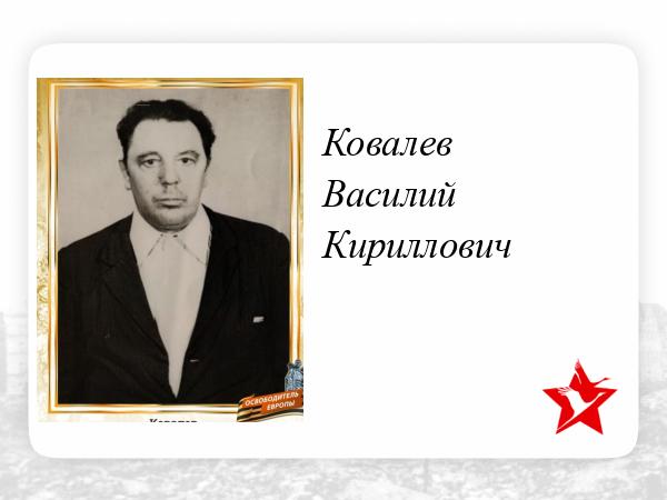 Мой папа, Ковалев Василий Кириллович в сентябре 1941 года уходит добровольцем на фронт. Был зачислен в запасной полк, где прошел обучение военному делу и только затем был направлен в маршевые войска. Свой боевой путь начинает в должности рядового бойца, на Волховском фронте, в 124 Отд. Бригаде 2-я УА, а затем принимал участие в боевых действиях на Северо-3ападном фронте, в составе 42 СП 180 СД. В феврале 1942 года стрелковая дивизия вела успешные бои в районе реки и станции Пола. В боях за станцию Пола, с немецко-фашистскими захватчиками, за мужество и героизм был награжден Орденом Отечественной войны II степени, но в этом бою получил тяжелое ранение в грудь. Был направлен в тыл, для лечения и реабилитации, пробыл в госпитале несколько месяцев. После выздоровления зачислен в запасной полк, а затем вернулся в ряды Красной Армии, для дальнейшей защиты Родины. Воевал на Северо-Западном фронте, в составе 42 Гв.СП 128 Гв.СД. За годы войны был три раза ранен, ранения были разной степени тяжести. Инвалид войны 3 группы. Оставался в боевом строю до самой Великой Победы, праздновал окончание войны в Румынии!
