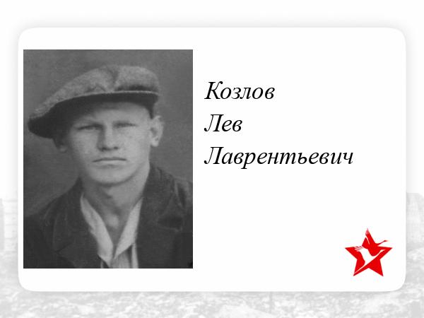 Козлов Лев Лаврентьевич, 1909 г.р., аспирант химического факультета Ленинградского университета, доброволец, зачислен в 291 СП Северо-Западного фронта с июля 1941г. Хорошо владел немецким языком, ходил в разведку. Убит 09.09.1941. Женат не был. Родные - Козловы: мать - Лина Кузьминична, сестра - Антонина , брат - Евгений.