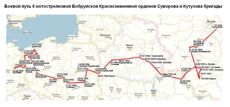 10 июня 1945г. переход на новые штатные расписания- бригада преобразована в 8 Мотострелковый Бобруйский Краснознаменный орденов Суворова и Кутузова полк.