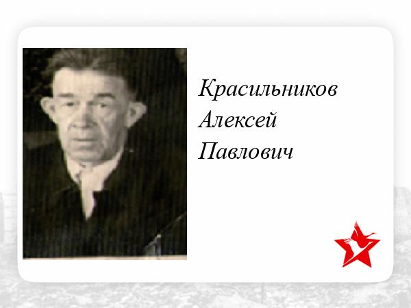 Красильников Алексей Павлович родился в 1905 году. 28 декабря 1941 года был призван в действующую армию. Воевал на северо-западном фронте. В 1943 году получил пулевое ранение в голову. Имел государственные награды: медаль "За боевые заслуги" и "За победу над Германией"