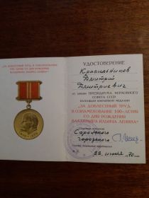 Красильников Дмитрий Дмитриевич(15.06.1915-24.07.1973). Член КПСС с 1941г. Участник боев у озера Хасан - награжден высшей наградой правительства — медалью «За боевые заслуги» войсковая часть 5445 1939г., на фронтах Великой Отечественной Войны. 13 августа 1944 года в Полесском районе Киевской области лично в ночное время задержал двух немецких парашютистов-диверсантов с подрывными средствами. Эти парашютисты-диверсанты имели задание взрывать паровозы с военными эшелонами следовавшими на фронт. По материалам расследования было установлено, что в течение двух ночей их было выброшено с самолетов на парашютах всего 72 человека на территорию Украинской ССР. В марте 1944 года сбежавший из-под следствия крупный немецкий резидент по фамилии Охрименко укрывался в лесу и организовал банду из числа немецких преступников, со стороны т.Красильникова принятыми мерами и оперативными действиями было установлено место появления преступника в лесу и при помощи засады задержан,но руководитель банды оказал сопротивление и в борьбе один на один был смертельно ранен, а банда после этого была ликвидирована. После освобождения Полесского района, Киевской области от временной немецко-фашистской оккупации Красильников Дмитрий Дмитриевич, был направлен в район на должность ст.оперуполномоченного РО МГБ. Принимал активное участие в разоблачении и изолировании немецких прислужников, предателей Родины, вел активную борьбу с вооруженными бандами украинских националистов, возглавляя руководство по их ликвидации.