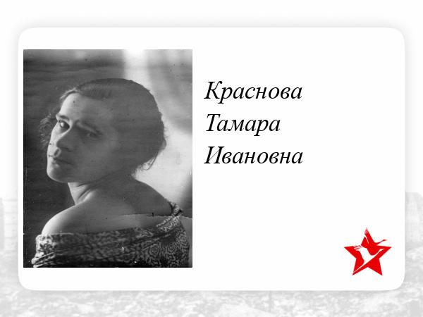 Краснова Тамара Ивановна-единственная дочь у своих родителей! Ее братья - участники Великой Отечественно Войны! Единственная сестра моего деда Тамара Ивановна,нежная девушка была участником обороны Москвы.Имела звание лейтенанта и награждена медалью За оборону Москвы.