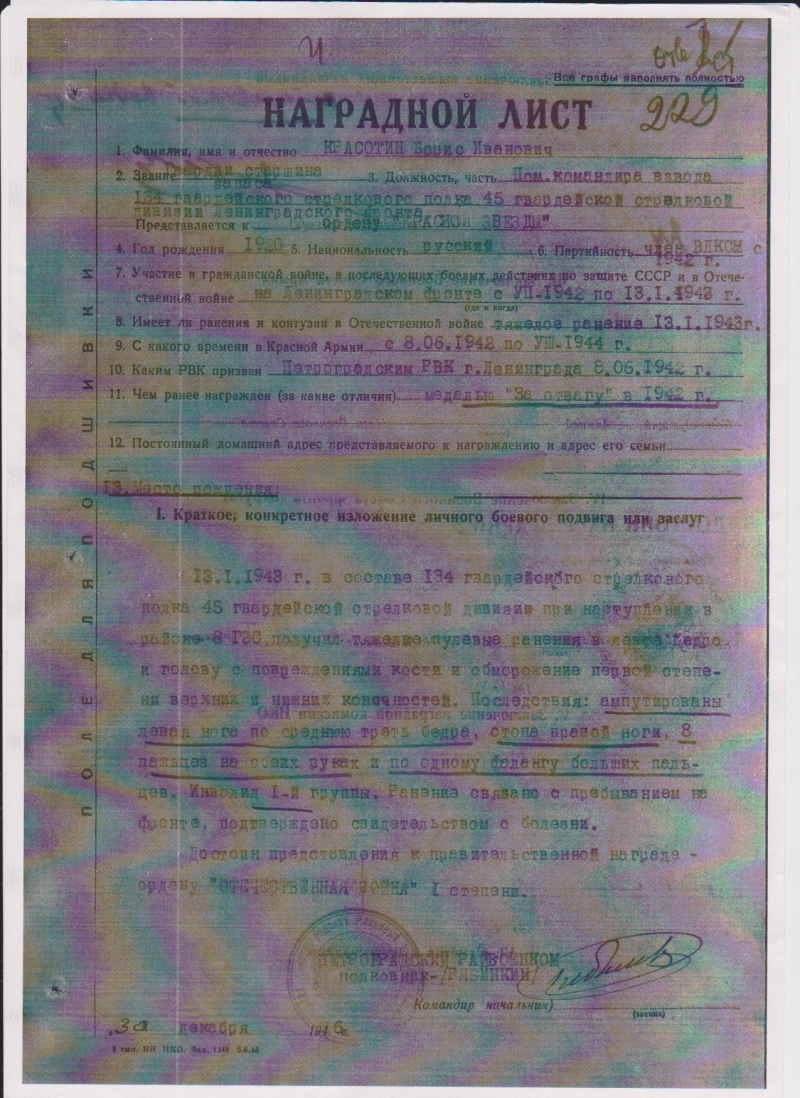 В ходе битвы за Ленинград получил ранение и был представлен к ордену "Отечественная Война" 1 степени.
