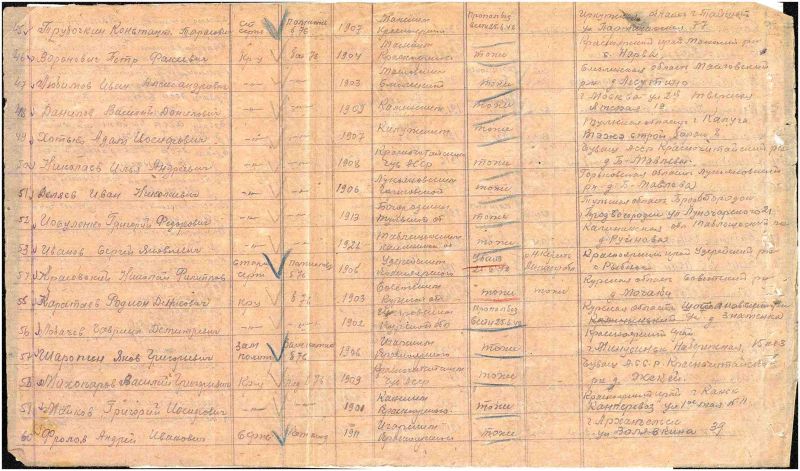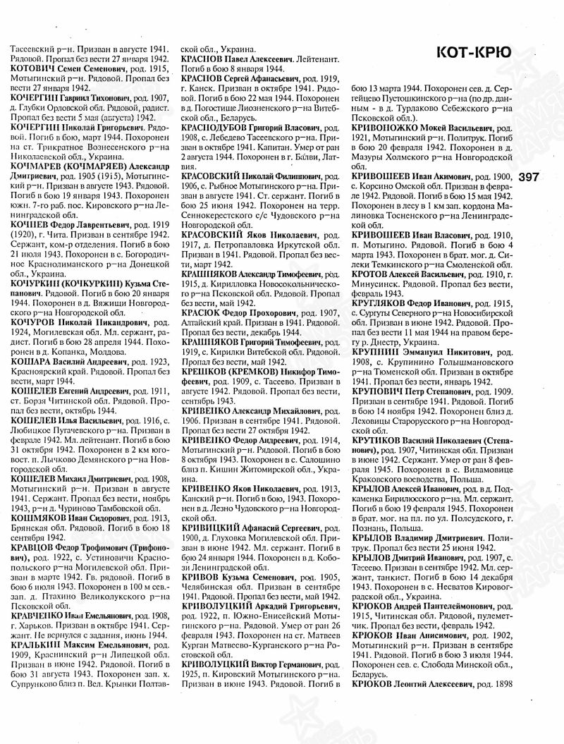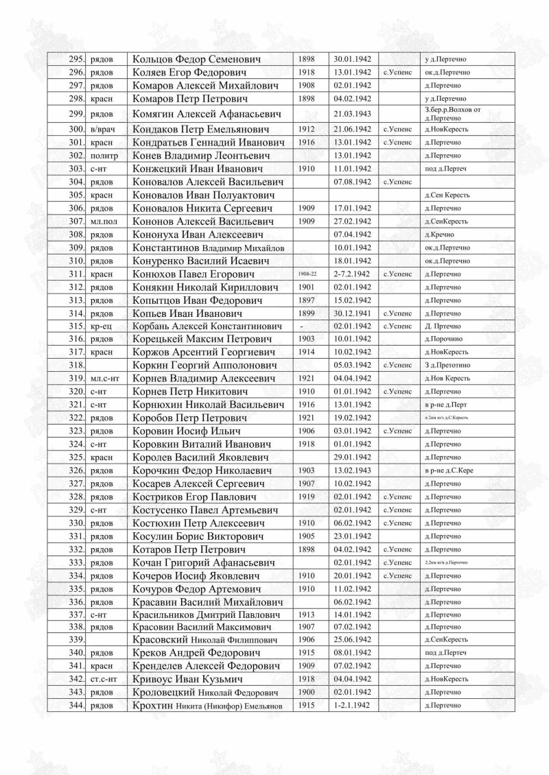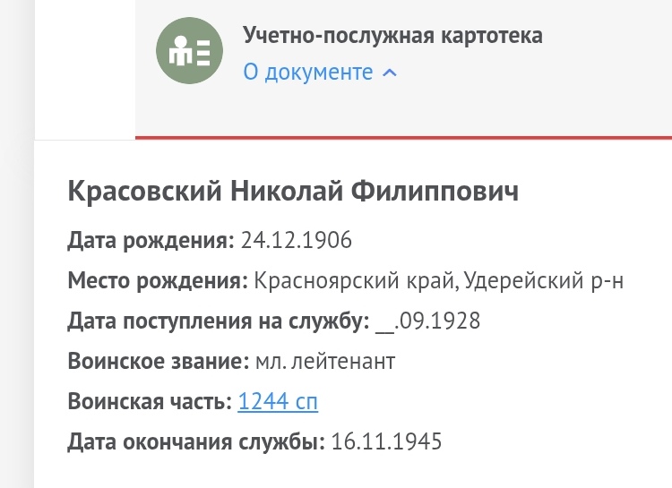 Красовский Николай Филиппович, 1906 г. р. Место рождения Красноярский край, Удерейский район, с. Рыбное. Бухгалтер. Проходил службу в рядах РККА с 1928 года. Призван Удерейским РВК в 1941 году. Младший лейтенант. Командир взвода. В/ч 1244 сп 374 сд. Убит в бою 25.06.1942 года. Похоронен Ленинградская область, Новгородский район, д. Новая Кересть. Перезахоронен Новгородская область, Чудовский район, с. Успенское. ЖИВ. Попал в плен 26.06.1942 года в Ленинградской области, д. Мясной Бор. Лагеря для военнопленных находились в Литве и Германии. Освобожден 6.05.1945 года. Проверку прошел 16.11.1945 года. Умер в 1983 году, похоронен в г. Красноярск. Мать Красовская Екатерина Кирилловна.