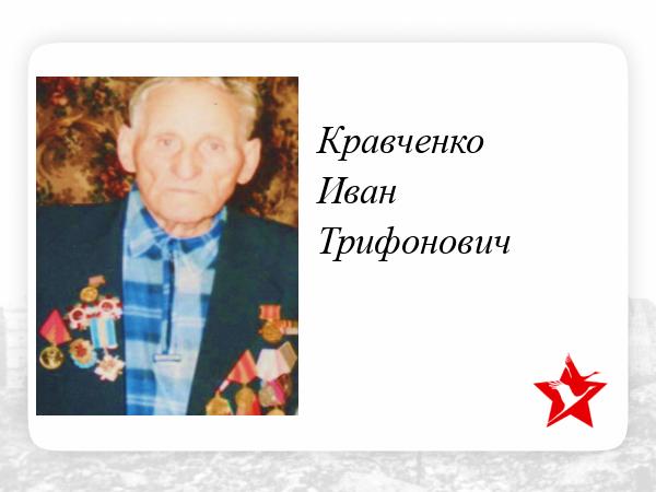 Кравченко Иван Трифонович был призван в армию в 1942 году. Ушел на войну со школы, с восьмого класса. Служил в 700 полку. Принимал участие в боях за Беларусь, Польшу, в Польше был ранен в ногу. О подвигах подразделения, в котором служил Иван Трифонович, писали в газетах. К сожалению, фронтовые письма, дневники и личные вещи не сохранились. Во время войны он потерял семью.