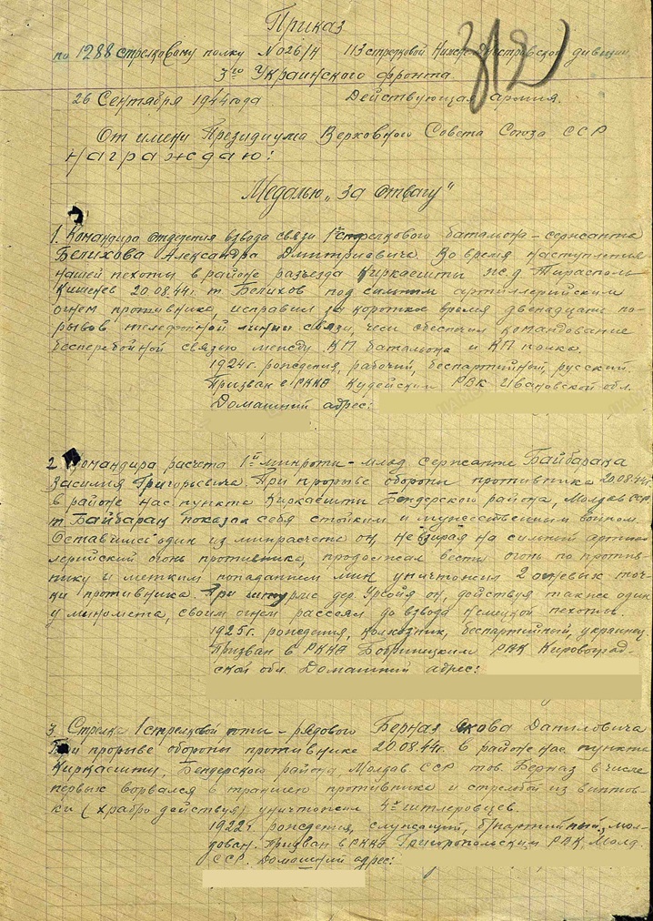 Август - сентябрь 1944 г. – разведчик 1-й минометной роты, рядовой, 1288 сп 113 стрелковой Нижне-Днестровской дивизии 3-го Украинского Фронта, Молдавия, участник Ясско-Кишинёвской стратегической операции (20 — 29 августа 1944 года) , в результате которой была освобождена вся Молдавская ССР, а Румыния объявила войну Германии.