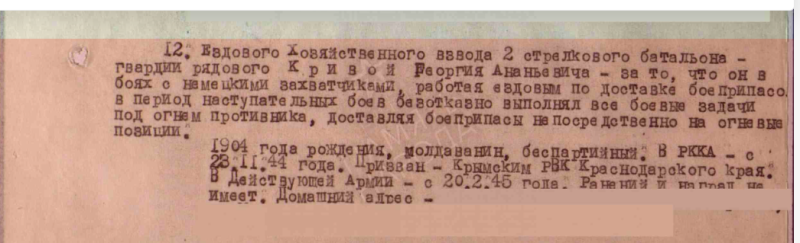 1904 Место призыва Крымский РВК, Краснодарский край, Крымский р-н Воинское звание гв. рядовой ; гв. красноармеец ; рядовой Воинская часть 314 гвардейский стрелковый полк 102 гвардейской стрелковой дивизии