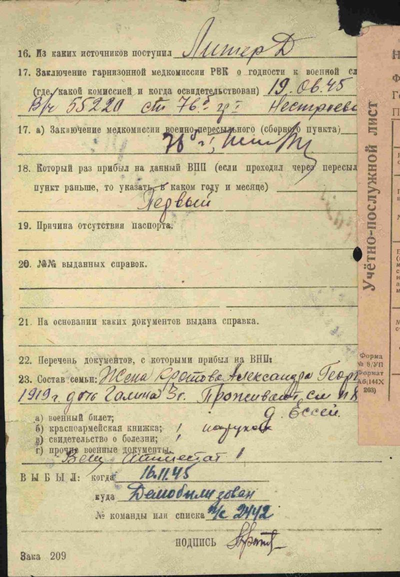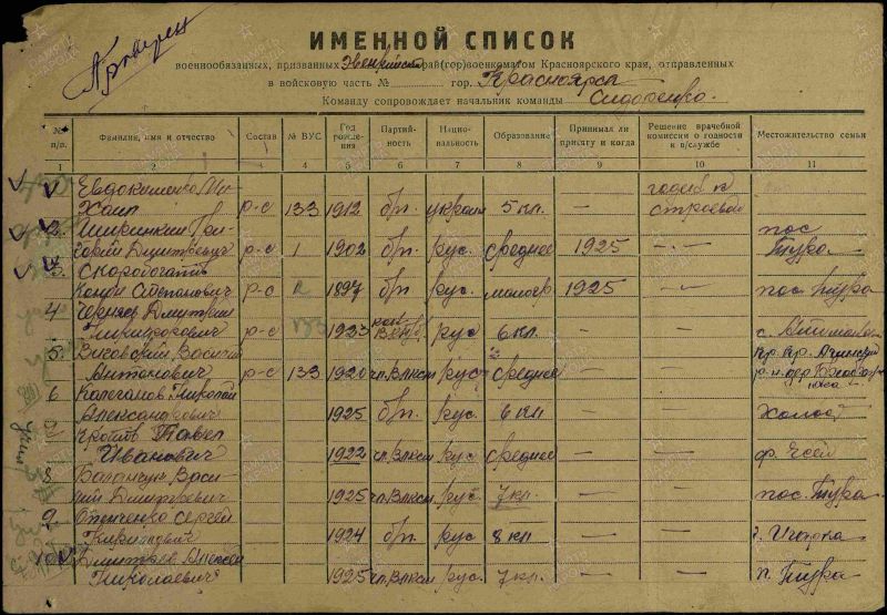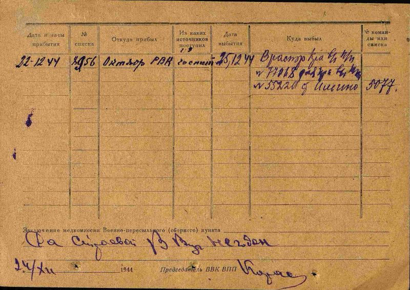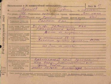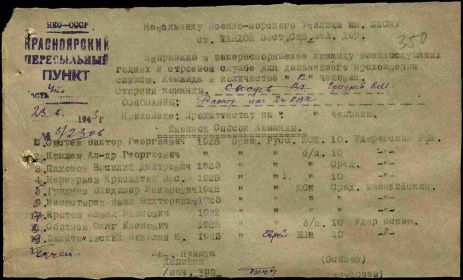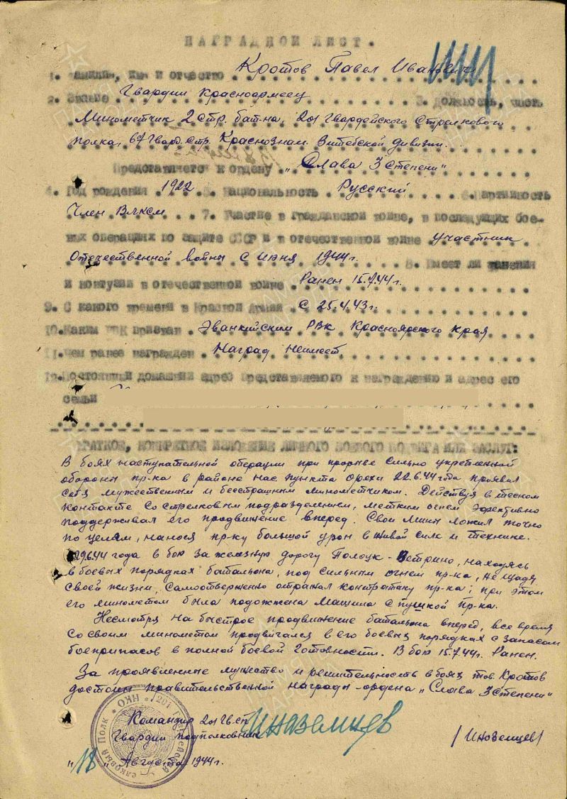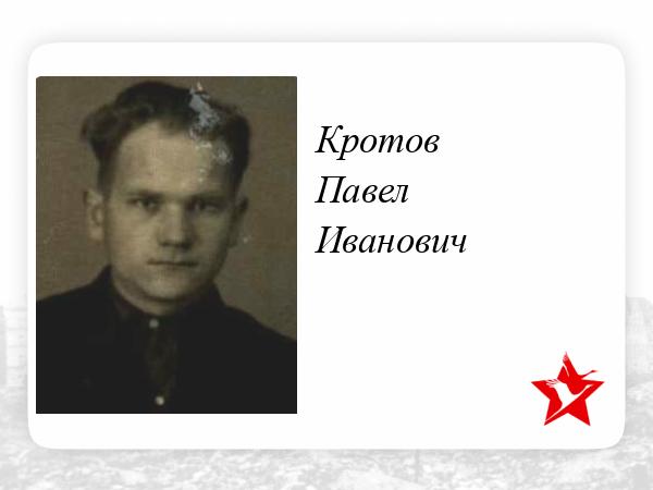Кротов Павел Иванович, 1922г.р Место рождения Ивановская область, Шуйский район, д.Запрудново. До войны жил в Красноярском крае, ЭНО, Илимпийский район, ф.Ессей,работал вет.фельдшером. Призван Эвенкийским ОВК в 1943 году. Выбыл в Военно-морское училище БО им.ЛКСМ,ст.Танхой Восточно-Сибирской ж/д. Гв.красноармеец. Минометчик. В/ч 201 гв.сп 67 гв.сд.Ранен в ногу 15.07.1944 года,ЭГ 5846 (по справочнику Солдат.ру дислокация г.Иваново).Награжден орденом Славы 3 степени, медалью За Победу над Германией в Великой Отечественной войне 1941-45гг. Дата окончания службы сентябрь 1945 года.Жена Юрьева Александра Георгиевна,дочь Галина проживали на ф.Ессей.