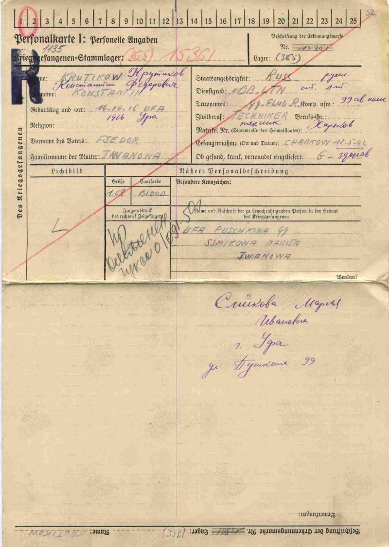 11 мая 1942 года ст. лейтенант Крутиков К.Ф. и стрелок-радист ст. лейтенант Муравьёв Н.П. не вернулись с боевого задания, попали в плен. Муравьёву удалось бежать и вернуться в свой полк. А Константин Крутиков попал в шталаг №365 (Австрия). После окончания войны был освобождён из лагеря, прошёл через проверочно-фильтрационный пункт НКВД и в декабре 1945 года был демобилизован из армии. Дальнейшая судьба неизвестна. Вечная память герою!
