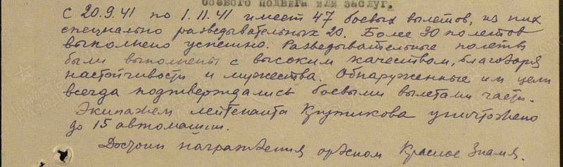 Вот один из боевых эпизодов:"26.1.42 в составе звена- командир экипажа ст.лейтенант КРУТИКОВ, штурман капитан ТУРИКОВ, стрелок-радист ст.лейтенант МУРАВЬЁВ бомбили скопление автомашин г.Чугуев, с высоты 1800 м.с двух заходов сбросили бомбы, в результате возникло 3 очага пожара и сильный взрыв на окраине города. При возвращении с задания были атакованы двумя Х-113, в результате воздушного боя один Х-113 был подбит и дымящим пошёл к земле. Вторым истребителем пр-ка самолёт был подожжён. Экипаж на горящем самолёте, перетянув линию фронта приземлился на своей территории в д. АРТЁМОВКА. Экипаж невредим, данные подтверждены экипажами и наземными войсками."