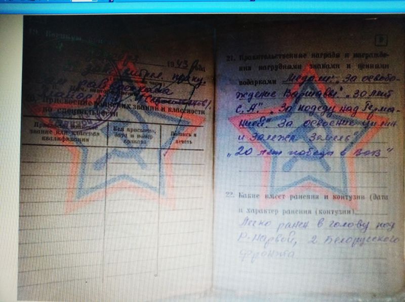 Мой дед попал на фронт в 1943 году. Воевал в составе 118 стрелкового полка 2 Белорусского фронта командиром стрелкового отделения ПТР. В ходе боев под р.Нарвой в апреле 1945 года он был ранен в голову и эвакуирован в госпиталь, находившийся в г. Вышков.