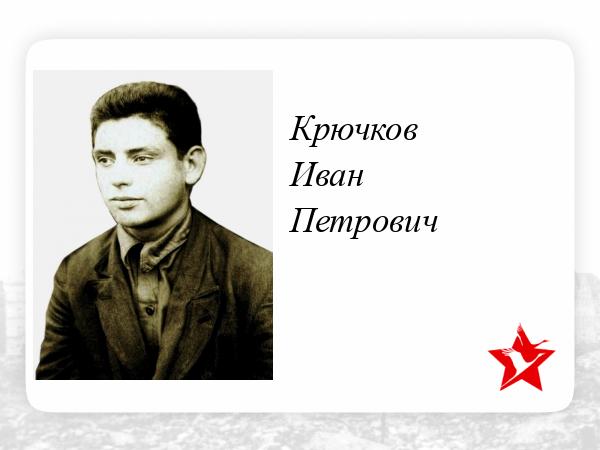Кавалер ордена Ленина, Крючков Иван Петрович, Родился в 1920 г. в селе Лошкарёвке, ныне Никопольского района Днепропетровской области, в семье служащих. Украинец. Образование среднее. Работал в колхозе. В Красной Армии – с 1940 г. С января 1942 г. участвовал в боях на Западном фронте. 27.01.1942 г. в разведывательном поиске в районе деревни Войново, ныне Калужской области, помощник командира взвода 53-го отдельного батальона охраны штаба 33-й армии Иван Крючков первым ворвался в расположение противника, уничтожив при этом 7-х солдат и ранив троих. 29.01.1942 г. в бою в деревне Костино той же области помкомвзвода Крючков оказался единственным оставшимся в живых его участником. Попав в окружение, перенёс ручной пулемёт на крышу здания школы и в течение часа вёл бой в одиночку, пока не расстрелял весь боекомплект патронов. Отклонив предложения о сдаче в плен, сдерживал попытки захвата здания огнём из автомата, затем пустил в ход ручные гранаты. Когда солдаты противника поняли, что храбрецу больше нечем обороняться, они ворвались в здание школы, надеясь взять его живым и расправиться за нанесённые потери. Он спрыгнул им навстречу сам – с последними гранатами, которые взорвал вместе с собой в гуще окруживших его вражеских солдат. Пришедшие на выручку однополчане насчитали на месте боя Ивана Крючкова до 40 уничтоженных немецких солдат и офицеров… По ходатайству командующего Западным фронтом генерала армии Г.Жукова Указом Президиума Верховного Совета СССР от 15 марта 1942 г. Иван Петрович Крючков награждён орденом Ленина (посмертно). Похоронен в братской могиле на ст. Износки Калужской области.