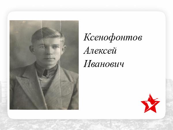 Ксенофонтов Алексей Иванович родился в г.Камышин Саратовской обл. (теперь Волгоградская обл.). Призывался на фронт из г.Душанбе (Таджикистан) сразу после окончания школы. Перед отправкой на фронт прошел краткосрочные курсы, затем служил в артиллерии в войсках под командованием К.К.Рокоссовского. На фотографии Ксенофонтов А.И. - ученик старших классов школы (школу он закончил с академической успеваемостью, но во время войны не давали золотые медали). Именно эту фотографию с дарственной надписью "Хоть подарок невелик, но забыть не велит" он оставил на память своей сестре, когда его всей семьей провожали в армию на фронт. Когда отправлялся эшелон с призывниками, сестра бежала за составом по перрону и кричала: "Леня, вот здесь, здесь, на этом самом месте мы будем тебя встречать!" На фронте Ксенофонтов А.И. был ранен, когда при ранении терял сознание, думал, что все, погибает. Но рана, к счастью, оказалась не очень тяжелой, и после лечения в госпитале Алексей вернулся в строй. День победы Алексей встретил в Германии, рассказывал, что после известия о победе радостные солдаты открыли бочки с пивом и начали им умываться и обливаться :) Алексей вернулся с фронта через несколько месяцев после окончания войны, с отличием закончил институт, затем отправился как молодой специалист на строительство Каракумского канала, прожил интересную содержательную жизнь, многого добился. Родные считали, что ему повезло служить под командованием К.К.Рокоссовского и я голосовала на сайте "Выбери имя Победы" за этого замечательного полководца. Алексей Иванович имел твердые убеждения, но в то же время был очень деликатным человеком, я помню, как кто-то из детей рассказал популярный в те времена (несколько десятков лет назад) анекдот о Чапаеве, дядя Леня (как мы его называли) вежливо упрекнул нас, спросив: "Разве мы не уважаем Чапаева? А если да, то зачем же рассказывать о нем анекдоты?" Сейчас остается только пожалеть, что в свое время я недостаточно пообщалась с таким интересным и много повидавшим человеком.