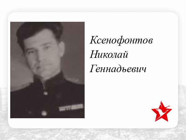 Ксенофонтов Н.Г. - это мой дядя, старший бра моего отцав. После окончания учительского института начал заботать заведующим начальной школой в Сусанинском районе Костромской области, но почти сразу был призван на срочную службу в армию. В это время началась война, и мой дядя оказался на фронте. Много раз я просила его рассказать о войне (самя я родилась в год Победы), однако он отмалчивался. Лишь один раз, когда у него отказали ноги, он предположил, что заболевание - это отголосок войны. У него оказался костный туберкулёз, связано это было с историей военного времени. Когда он пролежал целую ночь в мокром снегу. Но на войне, как он говорил, простуды не бывало. После войны он продолжил воинскую службу на Камчатке, в Закавказье, в Германии, откуда и вышел в отставку. Жил в Ярославле, где и похоронен.