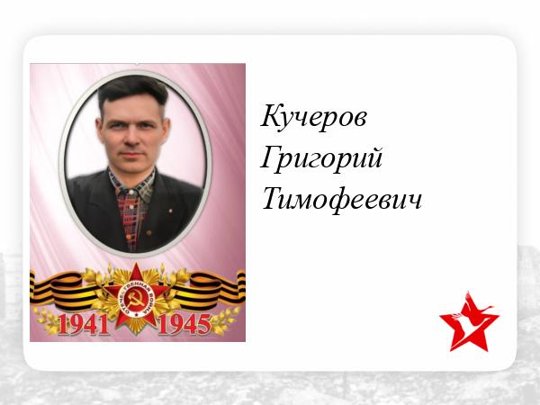 С началом войны, мой прадед Кучеров Григорий Тимофеевич, был призван на фронт в августе 1941г.Участвовал в боях летом 1942 г. под Сталинградом. Прошёл всю войну, освобождал Румынию, Польшу от немецко-фашистских захватчиков, .войну закончил в Чехословакии.27 октября 1945 г. был демобилизован.