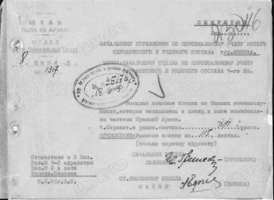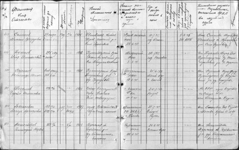 Кулаков Александр Иванович, 1905 г. р. Место рождения Красноярский край, Богучанский район, д. Заледеево. Призван Богучанским РВК в 1941 году. Красноармеец. Стрелок. В/ч 366 отд. сапер. б-он 189 сд. Попал в плен 25.06.1942 года в Ленинградской области, д. Мясной Бор-с. Волхов, в районе.Шталаг XI A.Германия, окр. Бранденбург, Альтенграбов. Освобожден 5.06.1945 года. Выбыл в 236 азсп. Жена Кулакова Мария Федоровна.