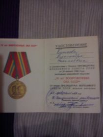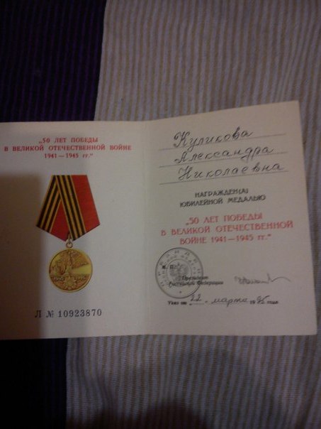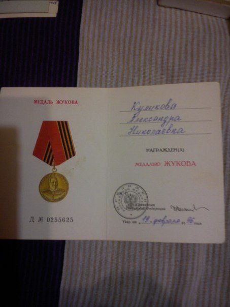 Говорит, что война ее очень закалила и сделала крепче. У бабушки много наград, одна из которых медаль Жукова, которой она была награждена за мужество, стойкость и, конечно же, за героизм во время боевых действиях с фашистами.