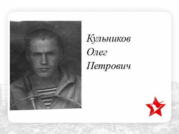 Кульников Олег Петрович родился в деревне Великая Чарозерского района Вологодской области. На момент начала войны в семье было четверо детей, Олег был старшим сыном. Жилось трудно и бедно, и в 14 лет Олег ушел из семьи учиться в ФЗО, чтобы младших детей было легче прокормить. 30.10.1944 года 17- летним подростком был призван на службу Полярным РВК Мурманской области в воинскую часть охраны водного района, служил матросом, рулевым. После окончания войны Олег Петрович остался служить в рядах Советской Армии и Флота до 15.05.1951 года. За время службы проявил себя храбрым и мужественным бойцом.