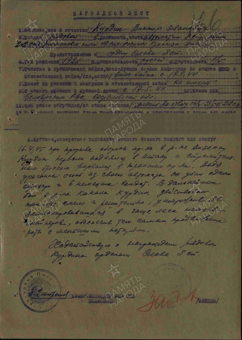 Из наградного листа от 22 апреля 1945 года «…16.4.45 при прорыве обороны противника в районе Визенау Курдин первым поднялся в атаку и стремительным броском ворвался в траншею противника. Ведя ураганный огонь из своего автомата, он убил одного офицера и 6 немецких солдат. В дальнейшем бою в районе Канала Курдин действовал также смело и решительно, уничтожив 3-х замаскировавшихся в чаще леса немцев-снайперов, обеспечив тем самым продвижение роты с меньшими потерями. Ходатайствую о награждении рядового Курдина Орденом Славы 3 ст…».