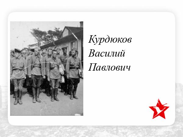 Старший политрук (капитан) КУРДЮКОВ ВАСИЛИЙ ПАВЛОВИЧ, 10.07.1902 года рождения, место рождения - РОССИЙСКАЯ ИМПЕРИЯ, Тамбовская губерния, Борисоглебский уезд, Уваровская волость, село Березовка (по административному делению: 1. СССР: РСФСР, Тамбовская область, Умётский район, Березовский сельский совет, село Берёзовка; 2. РОССИИ: Тамбовская область, Умётский муниципальный район, сельское поселение “Берёзовский сельский совет”, село Берёзовка), русский. В РККА призван в 1938 году. В Великой Отечественной войне, с 22.06.1941 года, в должности (последняя): Военного комиссара 7 отдельного эскадрона связи, 36 кавалерийской ордена Ленина Краснознамённой ордена Красной Звезды дивизии имени товарища И. В. Сталина, 6 казачьего кавалерийского корпуса имени И. В. Сталина, 10 Армии, Западного фронта. 3.07.1941 года, пленён: Белорусская ССР, Минская область, Воложинский район, в районе села Раков. В плену: Oflag 62 (XIII D) Хаммельбург (Hammelburg), военный округ XIII – Нюрнберг (Nürnberg), Бавария (Bayern), Третий Рейх (Das Dritte Reich); в н. вр.: г. Хаммельбург (Hammelburg), район Бад-Киссинген (Bad Kissingen), административный округ Нижняя Франкония (Unterfranken), федеральная земля Бавария (Bayern), ФРГ (Bundesrepublik Deutschland ), лагерный №1713. Выявлен, как политрук. Передан гестапо 5.11.1941 года. После 5.11.1941 года, расстрелян на учебном стрелковом полигоне школы снайперов СС, в качестве "живой мишени", под г. ХЕБЕРТСХАУЗЕН (Hebertshausen), Бавария (Bayern), Третий Рейх (Das Dritte Reich); в н. вр.: г. Хабертсхаузен (Hebertshausen), район Дахау (Dachau), федеральная земля Бавария (Bayern; Свободное государство Бавария (Freistaat Bayern), ФРГ (Bundesrepublik Deutschland). В списке Маргариты Котиковской порядковый №373. Родственники: РСФСР, Тамбовская область, Уметский район, Паревский сельский совет, деревня Варевка, жена - Курюкова Надежда Алексеевна.