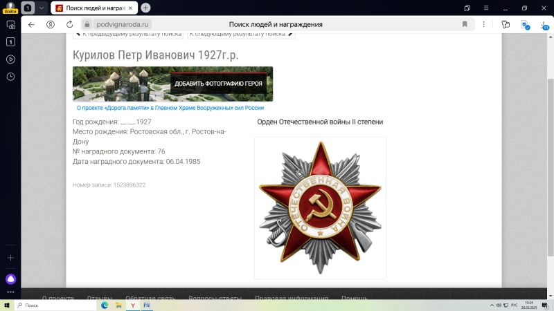 • Петр Иванович Курилов родился в 1927 г. в Ростове-на-Дону в семье рабочего. В 1941 г. пошел учиться в ремесленное училище, закончить ему помешала война. К Ростову приближались фашисты, и все, кто мог, были направлены на укрепление подступов к городу – рыли противотанковые рвы, окопы. Когда фашисты заняли Ростов учащихся эвакуировали в Ижевск. На новом месте не столько учились, сколько работали на оружейном заводе – изготавливали снаряды для фронта. К весне 1943 г. освободили Ростов. Петра, оказавшегося в Ижевске тянуло на родину в освобожденный город – ведь там остались родные. Но их не отпускали. Тем не менее несколько мальчишек в том числе и Курилов, самостоятельно покинули училище и вернулись в Ростов. Все документы остались в Ижевске, поэтому дальше учиться он не мог, да и на работу без документов не брали. П.И. Курилов подался в Харьков, где жила тетка. Приняли в школы фабрично-заводского обучения (lФЗО), но опять же не столько учился, сколько работал на заводе рядом со взрослыми – делали армейские кухни, мины, другое оружие. При поступлении ФЗО П.И. Курилов сказал, что потерял документы, и с его слов ему выдали справку, о том что он родился в 1925 г. Петр прибавил себе два года, так как рвался на фронт - мстить врагу за погибших отца и брата. В марте 1943 г. пошел в военкомат, где его без проблем зачислили в формировавшийся батальон, который отправили в Венгрию, под Будапешт. Попал в отделение разведки. В феврале 1945 г. Был ранен тяжело в голову, и до Дня Победы пролежал в госпитале в Будапеште. Домой вернулся после выздоровления в 1946 году, начал работать на родном заводе. В этом же году женился, родился сын. Однако жизнь была тяжелой – разруха , голод, болезни. С одним парнем решили под покровом ночи пробраться на колхозное поле, намолотили целый мешок зерна. И попались.. Судили по указу от 4 июня 1946 года «за расхищение народного добра». Дали 5 лет и отправили в Башкирию, где около двух лет работал на строительстве нефтепровода. Условия в лагере были ужасные, поэтому решился на побег. Поймали и добавили еще 5 лет по статье 58. В начале лета1949 г. пароходом "Ногин" привезли на Колыму. В колымских лагерях пришлось работать и на добыче золота, и на лесозаготовках, и в механических мастерских. В 1953 году освободился из лагеря "Бурхала" по амнистии. Выезд на материк не разрешили, остался работать по вольному найму.