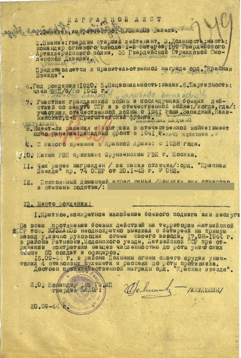 Наш отец, дед и прадед Кусжанов Жалель Кусжанович, родился 03.12.1920 г. в Майском р-не Семипалатинской (позднее Павлодарской) области Казахской ССР. В июне 1941 года окончил Ленинградское артиллерийское училище, должен был приступить к службе в Подмосковье после отпуска. Но 22 июня началась война. Был мобилизован Фрунзенским РВК г.Москвы, воевал с первого дня Великой отечественной войны до последнего, в составе 189 Гвардейского артиллерийского полка 56 Гвардейской стрелковой Смоленской дивизии, на Западном, Калининском, 2-м Прибалтийском фронтах. Был дважды ранен. Награжден двумя орденами Красной звезды и 6 медалями. Войну закончил на территории Восточной Пруссии, в г.Бреслау. Участник Парада Победы 24 июня 1945 года на Красной площади в Москве.