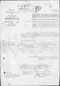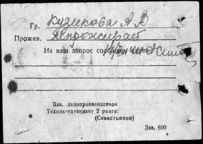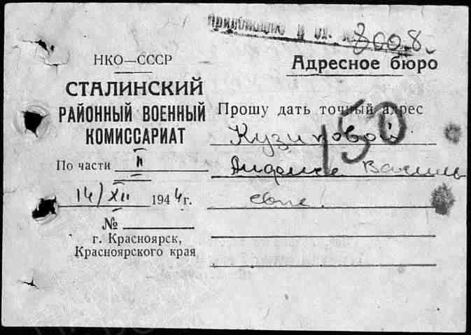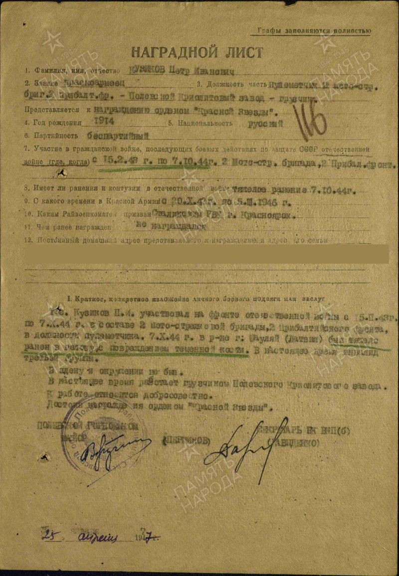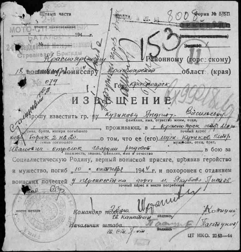 Кузиков Петр Иванович, 1914 г. р. Место рождения не указано, предположительно Красноярский край, г. Енисейск. До войны жил в г. Красноярск, ост. Молокова, барак 2 кв. 20. Призван Сталинским РВК, г. Красноярска в октябре 1942 года. Гв. красноармеец. Пулеметчик. В/ч 2 гв. мсбр 3 тк 5 гв. ТА. Тяжело ранен в голову с повреждением теменной части 7.10.1944 года. Умер от ран 10.10.1944 года. Похоронен Литва. Кретингский район, у перекрёстка дорог около м. Якубово. Извещение о смерти, жене Кузиковой Анфисе Васильевне, не вручено, т.к. адресат выбыл не известно куда. Кузиков Петр Иванович в списки безвозвратных потерь внесен ошибочно. ЖИВ. Выбыл из ЭГ 4921 (по справочнику Солдат. ру дислокация Литва, Радвилишкис) 3.11.1944 года. Инвалид войны. В 1947 году жил в Свердловской области, работал грузчиком на Полевском Криолитовом заводе. Награждён медалью За боевые заслуги (6.11.1947).