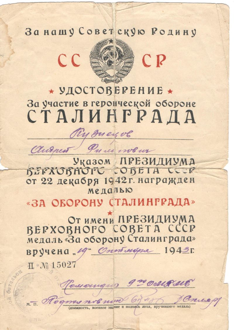 На переправе войск и техники через реку Висла в районе населенного пункта Застув в ночь на 4 августа сего года под артминометным огнем противника и бомбежками вражеской авиации красноармеец понтонер Кузнецов проявил мужество и отвагу несмотря на явную опасность для жизни упорно работал на пароме в составе понтонного расчета. Кузнецов только за одну ночь переправил на западный берег реки 20 автомашин с боеприпасми и продовольствием, 20 орудей разного колибра, дивизион Гварденских минометов и 300 человек обеспечив тем самым наши войска вооружением, расширением плацдарма на левобережье реки Висла.