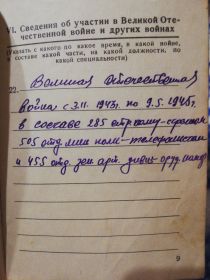 С ноября 1943 по октябрь 1944 проходил службу в стрелковом полку, затем с октября 1944 по ноябрь 1944 в отдельном миномётном полку телефонистом, после, с ноября 1944 по ноябрь 1945 в отдельном зенитном полку.