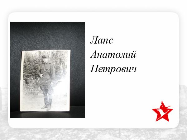 Мой отец, Лапс Анатолий Петрович, родился 24 сентября 1924 г.в с. Усть-Усинск Усинского района Красноярского края. Затем проживал в г.Томске на ул. Коммунистическая, откуда в 1942 г. был призван в армию и направлен курсантом в миномётное училище.