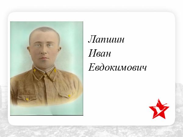 Фамилия Лапшин Имя Иван Отчество Евдокимович Дата рождения/Возраст __.__.1909 Дата и место призыва Камешкирский РВК, Пензенская обл., Камешкирский р-н Последнее место службы 19 Гв. сд Воинское звание красноармеец Причина выбытия убит Дата выбытия 25.02.1944 Первичное место захоронения Белорусская ССР, Витебская обл., Витебский р-н, д. Жирносеки, северо-западнее, в лесу