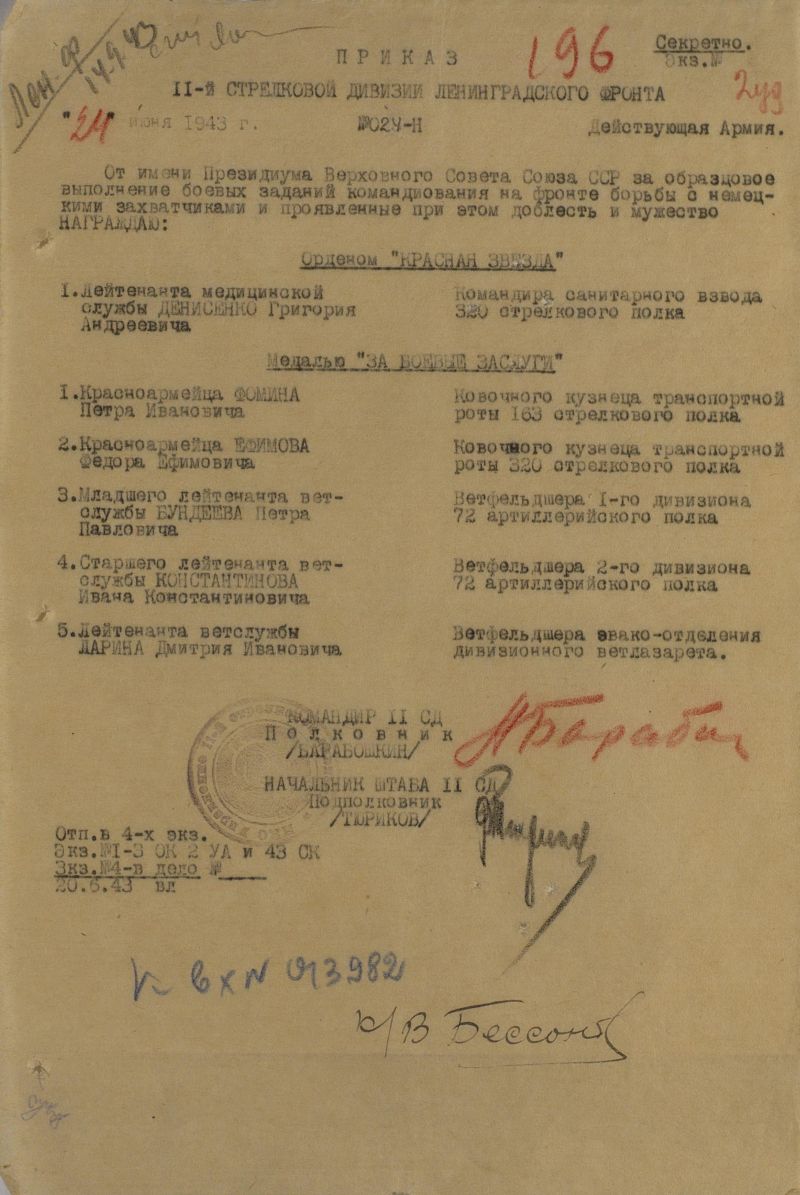Отец воевал на Ленинградском фронте. Война застала моего отца в Прибалтике, после окончания 20 выпуска Ленинградского военно-ветеринарного училища. В первый день войны в Прибалтике, из окон стреляли по солдатам. Отец в возрасте 21 года вернулся к товарищам только тогда, когда стемнело (выполз из-под окровавленных тел). Увидел изумленные лица товарищей, которые дали ему зеркало. Отец был седой несколько дней. Когда вывозили из под Ленинграда оставшихся в живых солдат, которые горстями вытряхивали из себя окопных вшей, очень много голодных солдат погибло от заворота кишок. По-русски, голодное население старалось их накормить. И невозможно было убедить голодных мальчишек, что им нельзя много есть.